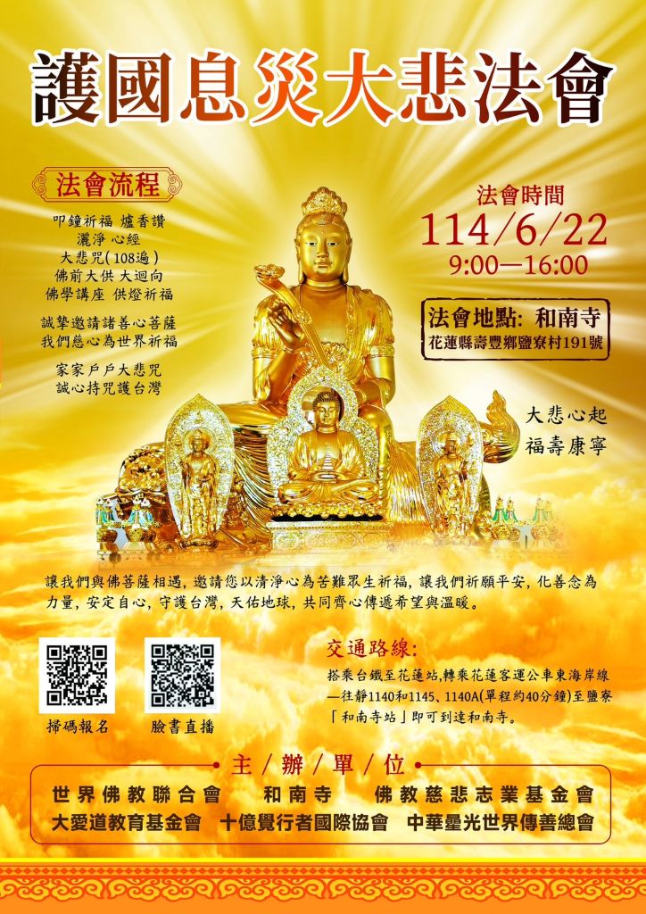 在地震頻仍、氣候異常、地磁紊亂與疫情復起的複雜情勢中,台灣佛教界啟動一場結合「祈福」與「實踐」的護國行動。由和南寺主辦的《護國息災大悲法會》,將於6月22日(週日)上午9時至下午4時,於花蓮縣壽豐鄉鹽寮村191號 隆重舉行。