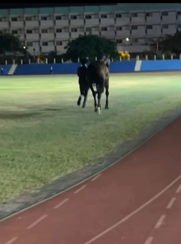 有網友在社群平台拍下影片,只見一匹馬被牽著在PU跑道與草皮區活動,網友笑稱「跑步遇到馬的機率有多高?」有人覺得新奇,也有人擔心馬若受驚嚇,恐影響周邊運動民眾的安全。