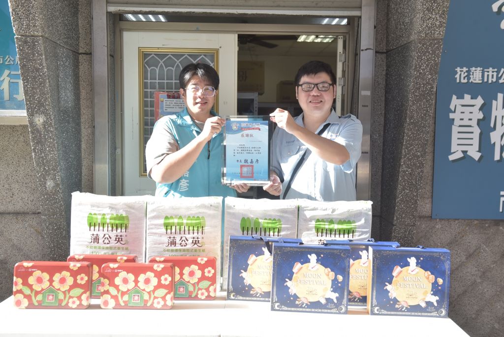花蓮市公所實物銀行在中秋前夕再次獲得善心捐贈!台灣中油馬太鞍加油站站長陳建丞,15日下午特地帶來30盒向「喜憨兒烘焙坊」及「微笑天使手作烘焙坊」認購的月餅禮盒,以及三箱衛生紙,捐贈給花蓮市公所實物銀行,期盼讓弱勢家庭也能在佳節感受溫暖氛圍。