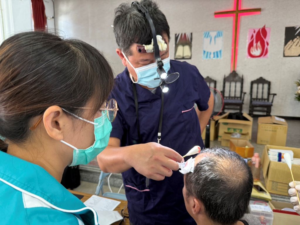 面對災後復建現場許多志工與居民因搬運重物、鏟泥受傷,門諾團隊也特別加入整形外科與耳鼻喉科醫師,現場提供縫合、清創與耳鼻喉照護等多元服務。