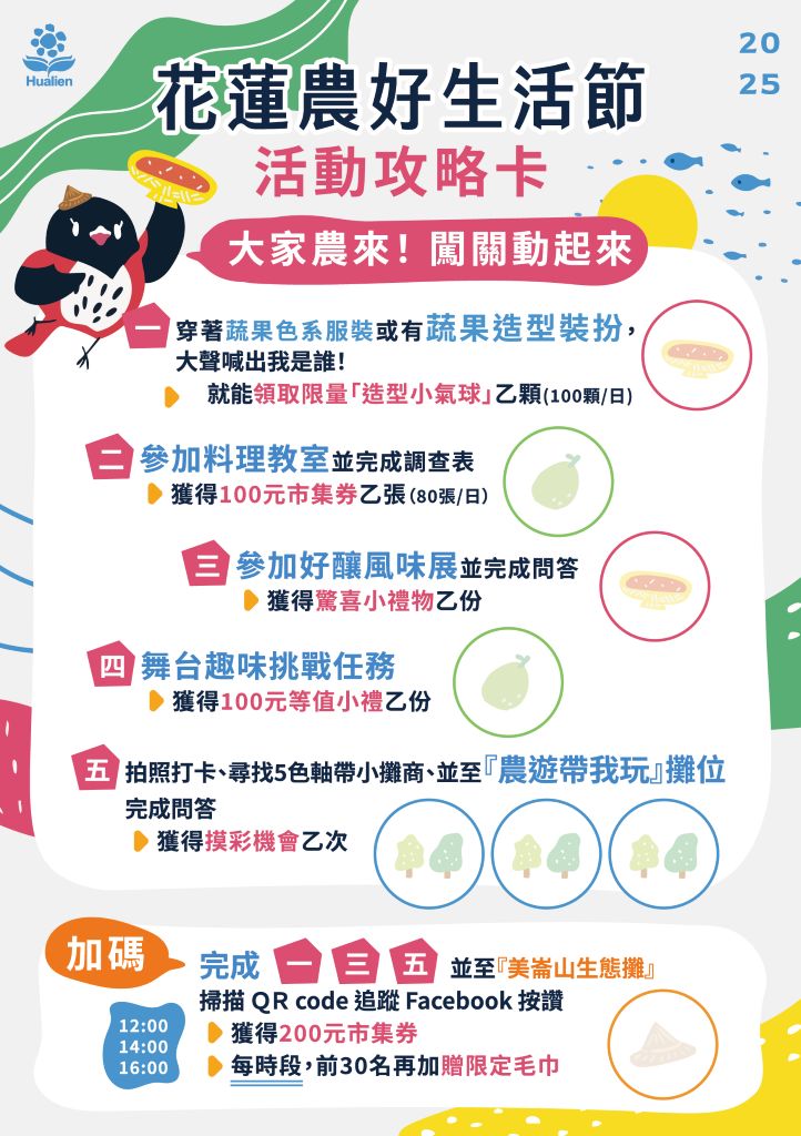 縣長徐榛蔚表示,今年特別規劃 五大亮點任務 邀請大小朋友一起體驗,包括蔬果造型打卡、花蓮好釀料理小教室、花蓮好釀風味展問答、舞台趣味挑戰,以及農遊軸帶闖關等活動。現場同步推出縣府加碼好康,完成指定任務即可領取 200 元市集券,每日三個時段限量兌換,前 30 名再加贈限定毛巾,讓民眾一路玩、一路拿好禮。