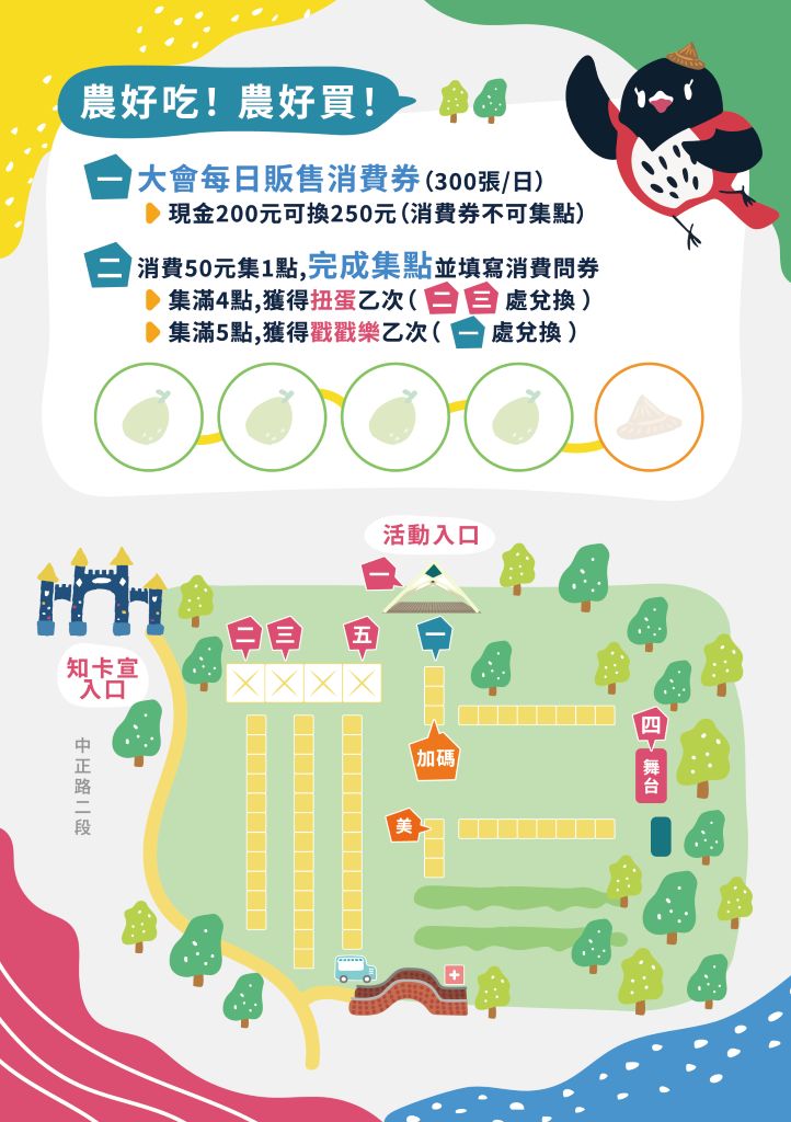 農業處處長陳淑雯說明,本屆活動規模再次提升,匯集超過 50 個在地特色攤位 展售。為支持在地小農與農產品牌,活動兩日推出限量消費券回饋,民眾可用 200 元現金換購 250 元市集折價券,每日限量 300 份。現場也安排消費集點活動,滿 50 元即可集 1 點,累積指定點數即可兌換扭蛋或戳戳樂,把精美小物帶回家。