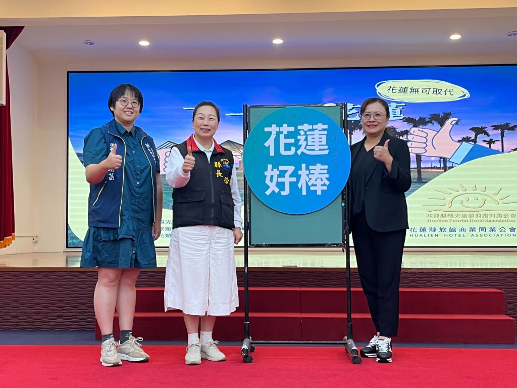 花蓮縣旅館商業同業公會和花蓮縣觀光旅館商業同業公會首次合作,推出擴大振興加碼活動,公會理事長張琄菡和張子菁在縣府大禮堂說明優惠內容,並在縣長徐榛蔚見證下簽署宣言。