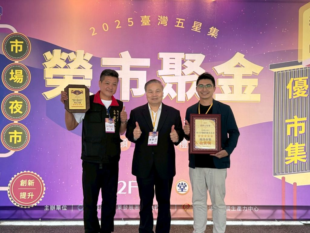 經濟部今(24日)在福華國際文教會館舉辦「2025榮市聚金~優良市集暨樂活名攤頒獎典禮」,花蓮東大門國際觀光夜市風光拿下市集最高榮譽全國唯一五星金賞,其他攤商則榮獲樂活名攤819顆星。花蓮縣政府副縣長顏新章帶領東大門夜市管委會主委及獲獎攤商們到場開心受獎!