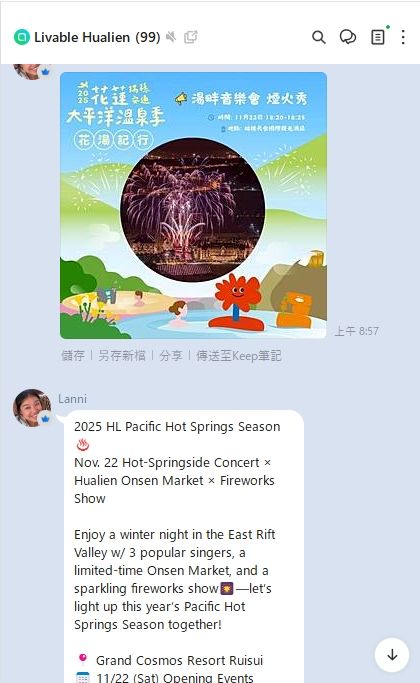 縣府更設置「Livable Hualien」LINE社群,每週至少以英文發布5則重要政策、活動與生活訊息,並即時回覆使用者提問。從基本民生問題到參與在地活動,國際人士都能透過手機即時取得協助,增加在花蓮生活的安全感與便利性。