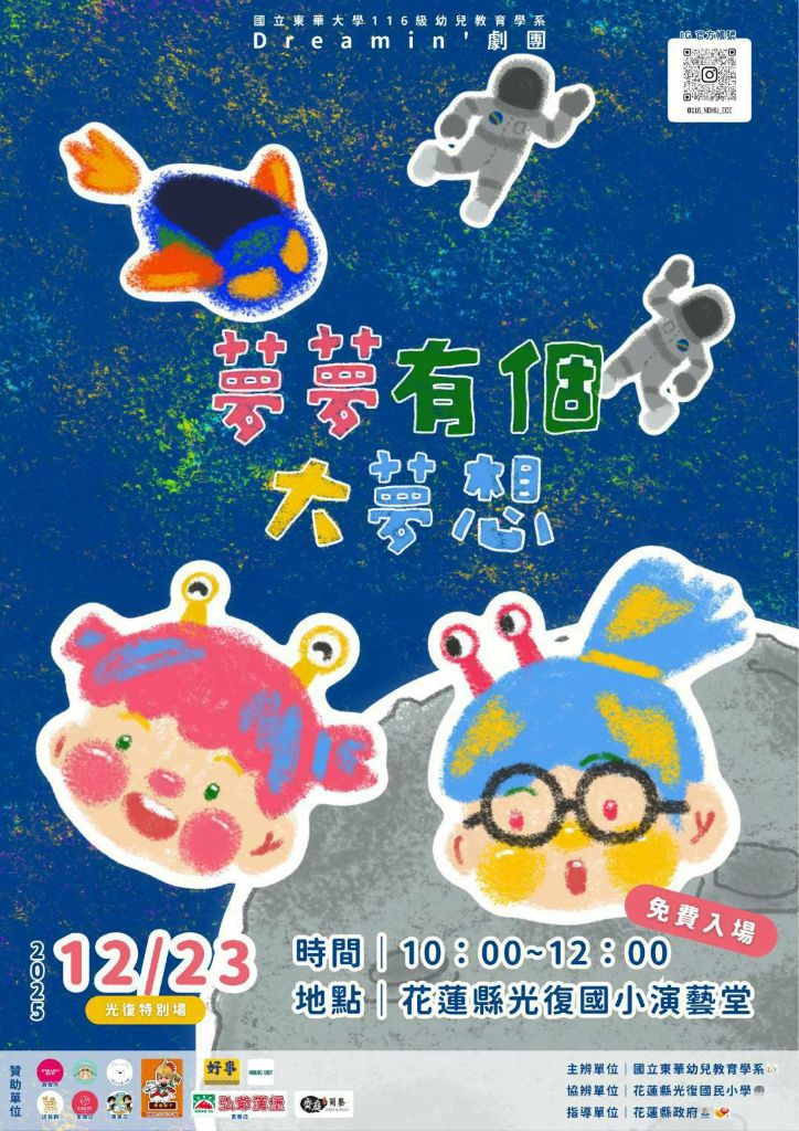 花蓮縣政府與國立東華大學幼兒教育學系合作,將於114年12月23日(星期二)上午10時在光復鄉光復國小辦理原創兒童劇 《夢夢有個大夢想!》。活動開放在地幼兒與家長免費入場,期待透過藝術走入社區,以兒童劇的溫暖力量陪伴0923風災後受影響的孩子與家庭,支持其情緒復原與安心成長。