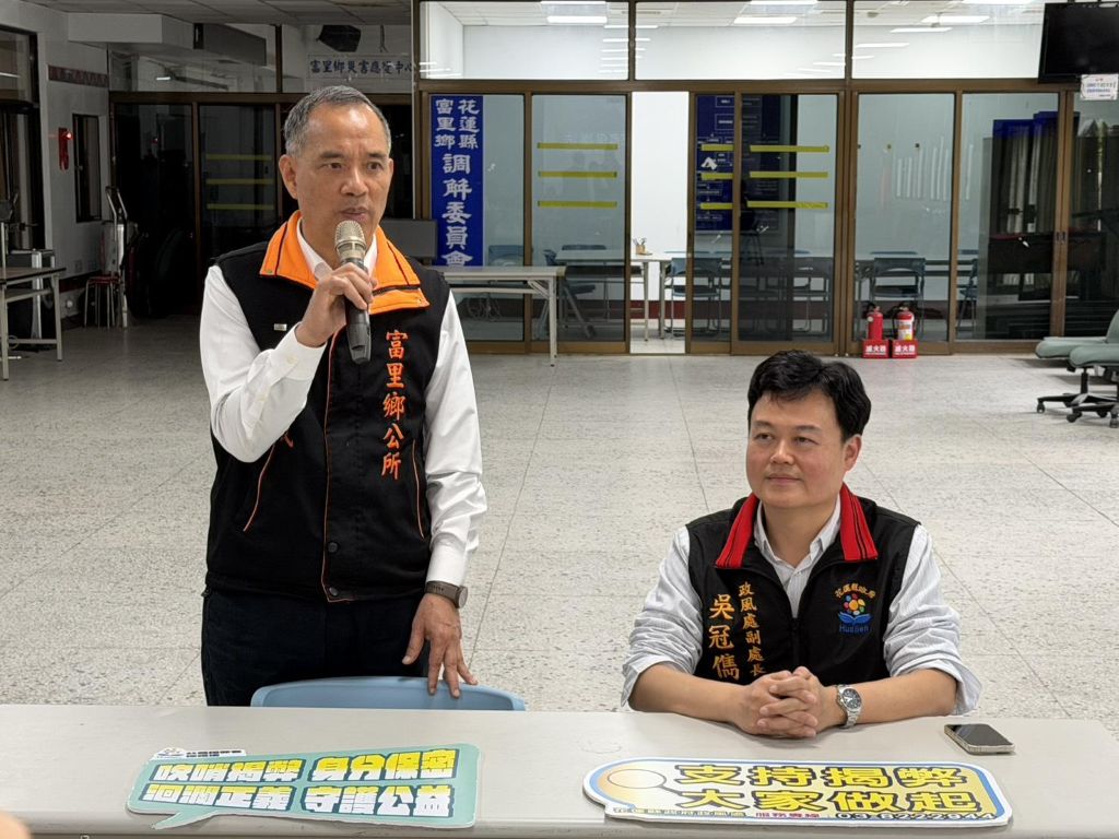 花蓮縣政府政風處於114年12月23日下鄉至富里鄉公所,辦理「公益揭弊者保護法說明會」,由政風處副處長吳冠儁率隊進行宣導。富里鄉鄉長江東成親自蒞臨會場致詞,肯定揭弊制度對公務廉能與機關治理的重要性,鄉公所各主管均到場參與,各課室同仁踴躍出席,現場學習氣氛濃厚。