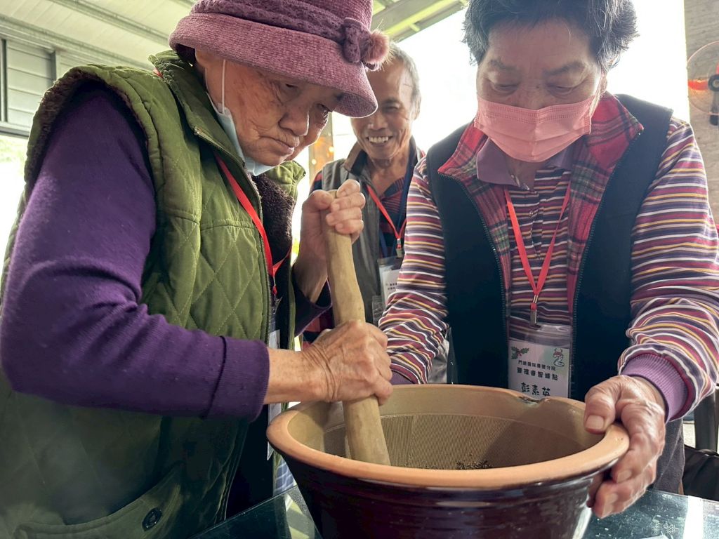 曾雯婷指出,這次外出活動中,許多長輩在熟悉的地名與景象刺激下,出現難得的主動表達與情緒回應。尤其在體驗客家擂茶時,當長輩親手拿起擂缽與擂棒,慢慢研磨茶葉與穀物,有人專注地跟著節奏動作,有人一邊動手、一邊分享過去在家中喝擂茶的回憶。茶香在空氣中瀰漫,現場不時傳來笑聲,氣氛溫暖而自然。