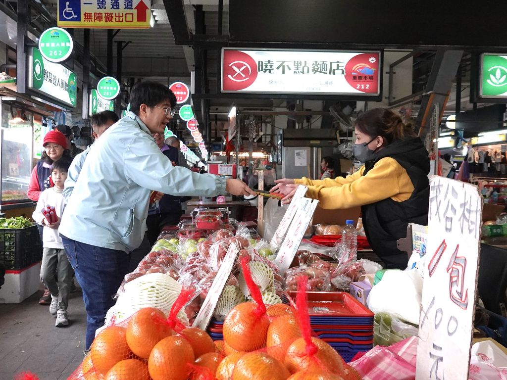 農曆春節將近,花蓮市長魏嘉彥4日把拜年行程提前搬進市場,偕同花蓮市民代表會主席楊哲灃走訪重慶市場與中山市場,向攤商與採買民眾拜早年,並發送市公所印製的春聯,為市場注入濃濃年節氛圍。花蓮縣議員魏嘉賢也到場致意,發送「花蓮鼠」環保袋,讓消費者採買更便利。