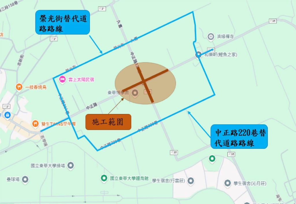 考量該路段平時多為社區居民、民宿業者及學生通行,施工期間交通影響較大,縣府將要求施工廠商加緊作業,預計於3月18日完成路口改善並恢復通車。在此期間,建議民眾改由榮光街及中正路220巷作為替代道路通行。