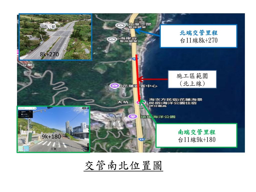 本次施工路段位於台11線8k+270至9k+180區間,鄰近遠雄海洋公園一帶。由於路基出現掏空情形,為確保行車安全並配合修復作業,施工期間將實施車道管制措施。