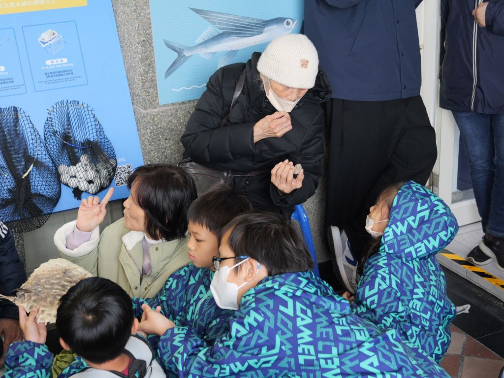 另一幕溫馨畫面出現在觀察鬼頭刀時。失智長者面對陌生事物往往較為緊張,林阿嬤一開始不敢觸摸魚體,一旁一年級周同學不斷鼓勵「阿嬤試試看!」在孩子的陪伴下,她終於伸手觸碰魚身,原本緊繃的表情瞬間轉為開心笑容。