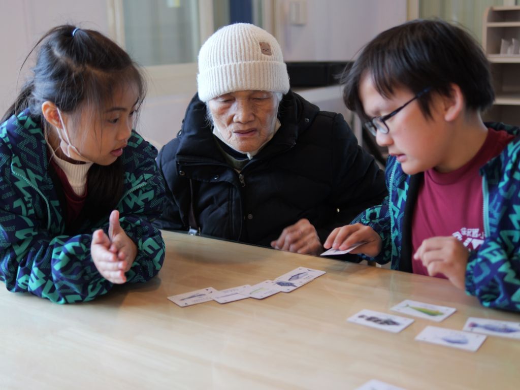 當失智長者與孩子肩並肩坐在海邊,課堂也不再只存在於教室裡。3月12日,門諾基金會與花蓮縣秀林鄉佳民國小合作的「老幼共學」課程首度走出校園,帶著三位新城失智據點長者與全校約70名師生前往「洄遊吧」食魚體驗館,展開一場跨越近80歲年齡差距的海岸探索之旅,讓跨世代學習延伸到真實的海洋場域。