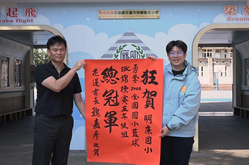 花蓮市明廉國小籃球隊在2026年EBC全國籃球賽中表現亮眼,一舉拿下五年級男子乙組全國總冠軍,不僅為校爭光,也替花蓮寫下榮耀新頁。花蓮市長魏嘉彥今(23)日特地前往學校張貼紅榜,親自向全校師生祝賀,現場掌聲與歡呼聲不斷,氣氛熱烈。