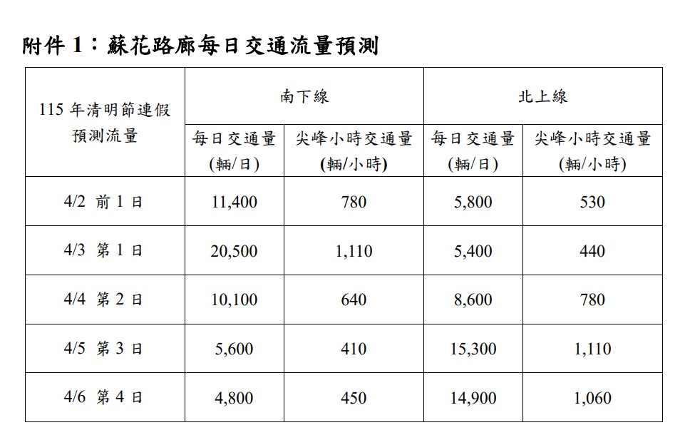 公路局指出,今年連假交通型態與往年相似,4月3日以南下旅次為主,車流集中時間長,平均車流量約每小時850至1000輛;而假期後段4月5日至6日則轉為北返車潮,其中4月5日為高峰日,北上全日交通量預估達1萬5300輛次,車潮將從上午10時一路延續至晚間9時後才會逐步紓解。