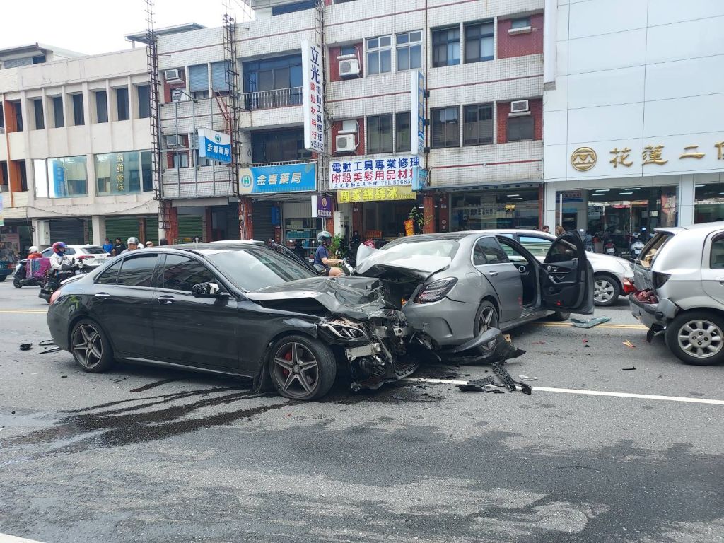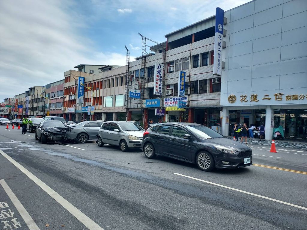 今(8)日下午花蓮市中山路與富安路交叉路口前發生一起連環車禍,多部車輛不明原因接連追撞,造成多人受傷。事故發生當下現場一片混亂,車輛毀損嚴重,交通一度受阻。