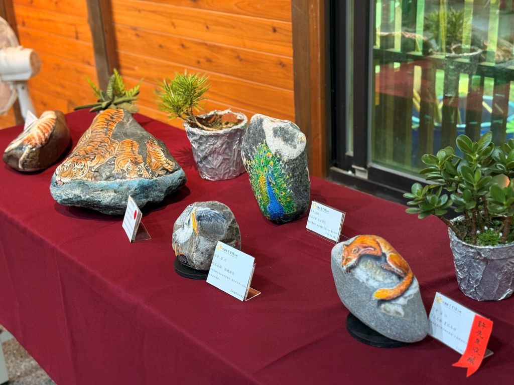 展覽分為兩大主軸,油畫作品以濃烈且層次豐富的筆觸,描繪家鄉山川風景與花卉靜物,色彩飽滿、情感細膩;石頭畫則運用天然石材原有的紋理與形狀進行創作,透過「因材施藝」,讓原本冰冷的石頭轉化為富有生命力的藝術品,呈現截然不同的視覺體驗。