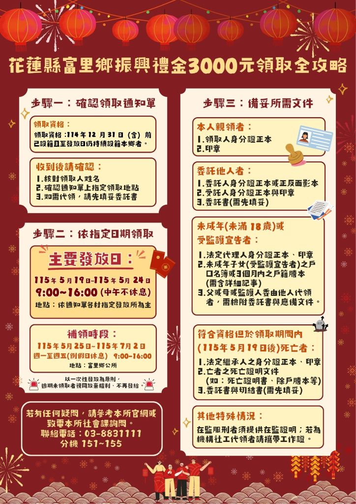 在資格方面,本次禮金發放對象須為114年12月31日前設籍於富里鄉,且發放當日仍持續設籍者。另針對114年底前出生但尚未完成戶籍登記的新生兒,只要在領取期限前完成登記並設籍,同樣具備領取資格。至於於5月19日前過世者不予發放;若於發放期間內過世,則可由法定繼承人代為領取。